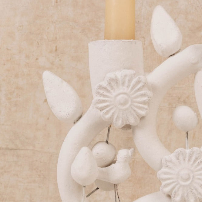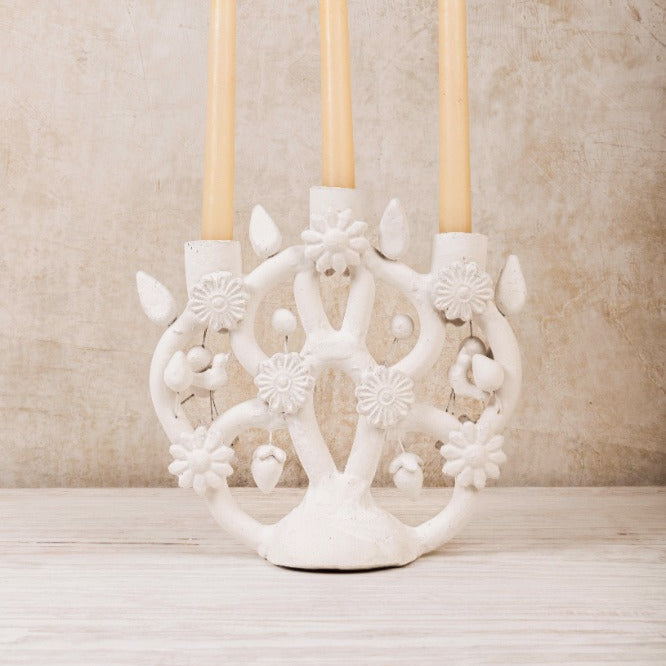 The iconic clay Tree of Life, representing the creation myth, was originally used by Spanish missionaries as a tool for evangelization. During the 19th century and into the first half of the 20th century, these candlesticks were given to newlywed couples as a symbol of fertility and abundance. Today, our simplified version, featuring flowers and birds, is the perfect piece for your table. Hand-molded and hand-painted in Izúcar de Matamoros, Puebla. Crafted by Joaquin Balbuena.