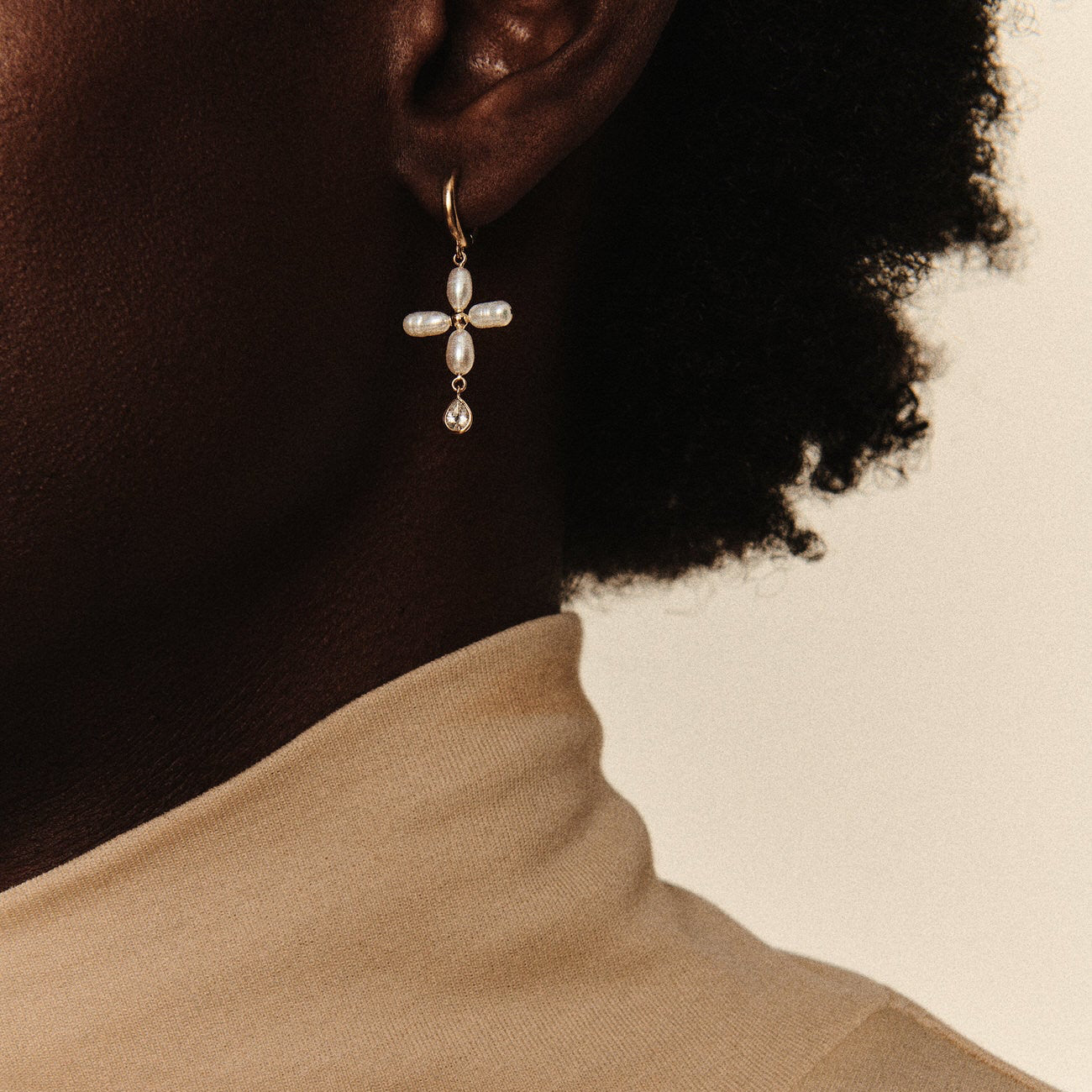 A mini hoop earring, for wearing by itself. A solid round gold ring with a floral motif that frames a golden bead and a white sapphire drop.
