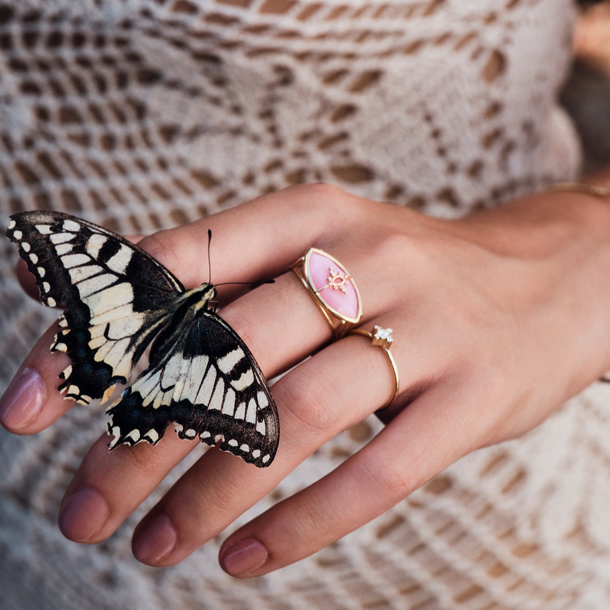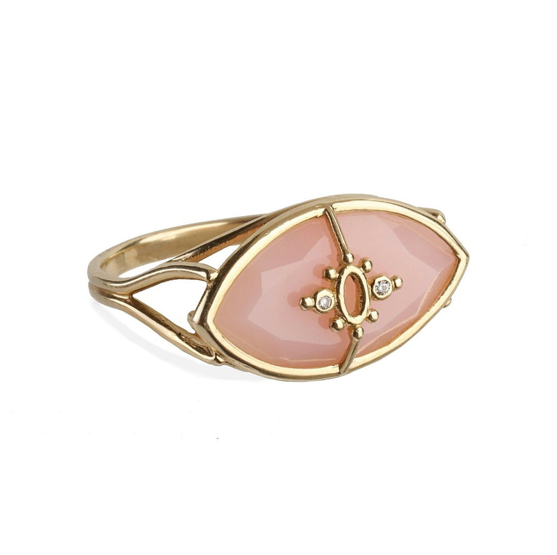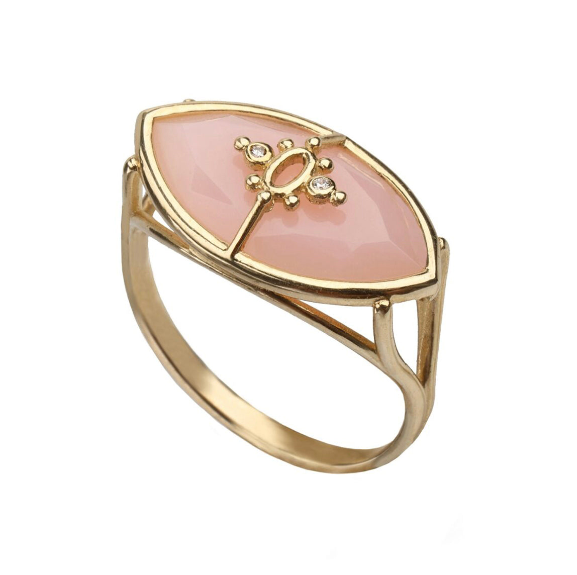 “Our eyes choose our paradises..”. A Collection that captures the spirit of poetic romance & female sensitivity, together with the finest of aesthetics and craftsmanship. The eye ring combines a marquise-cut pink opal set on 14K polished gold with two white diamonds 1mm and will highlight every special occasion, even if this is your everyday.