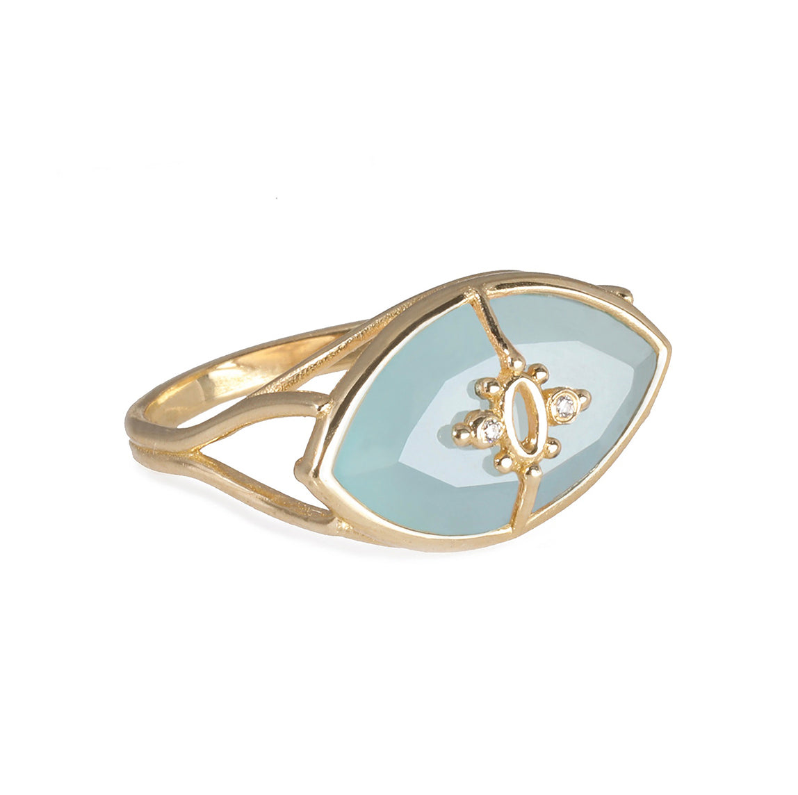 “Our eyes choose our paradises..”. A Collection that captures the spirit of poetic romance & female sensitivity, together with the finest of aesthetics and craftsmanship. The eye ring combines a marquise-cut blue chalcedony set on 14K polished gold with two white diamonds 1mm and will highlight every special occasion, even if this is your everyday.