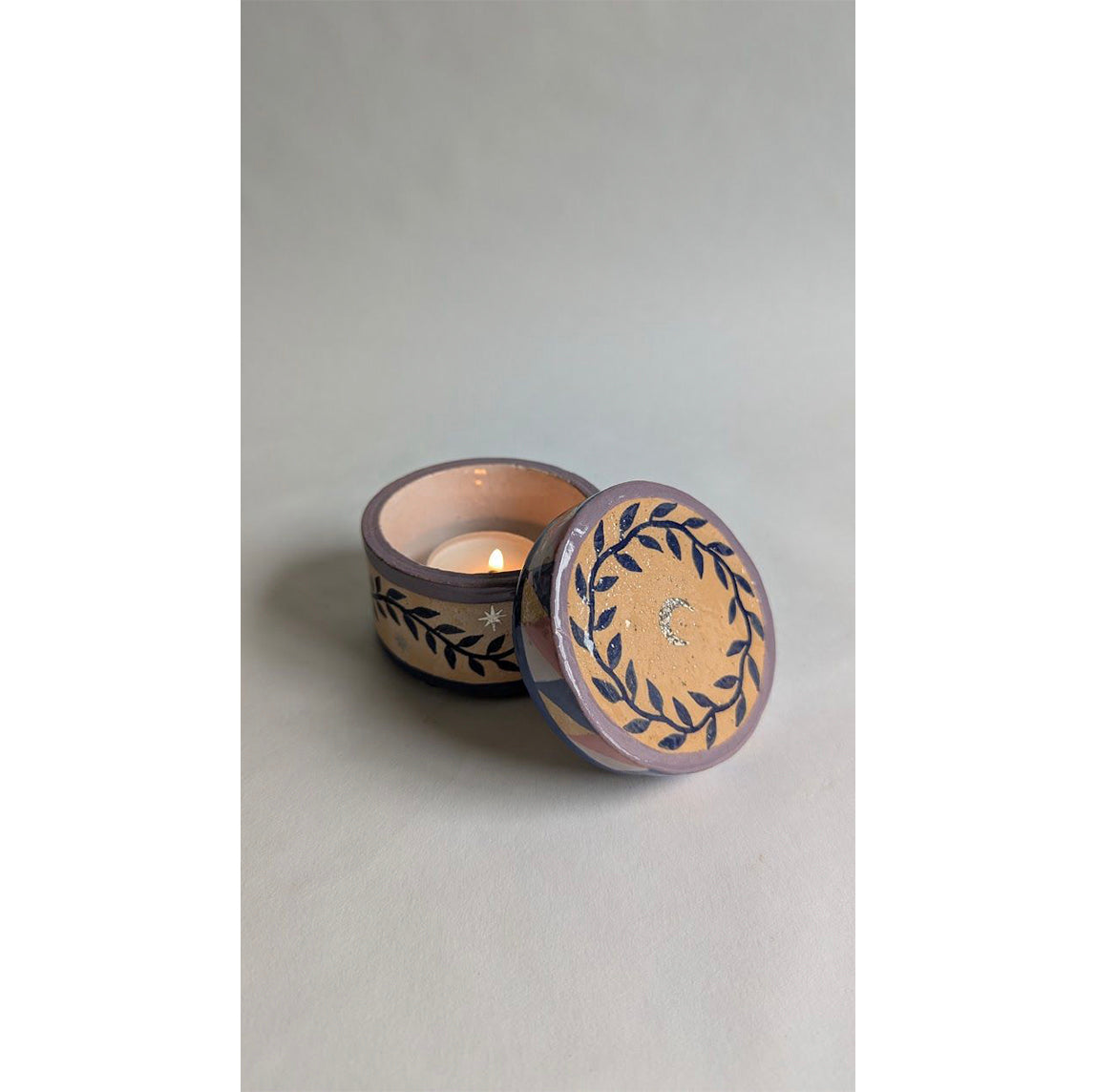 Hand-Painted Candle in Ceramic Jar. A beautifully crafted candle set in a hand-painted ceramic jar, adorned with celestial and botanical motifs. Designed to bring warmth, light, and intention to your space, this piece can be reused as a keepsake box long after the flame has burned out.