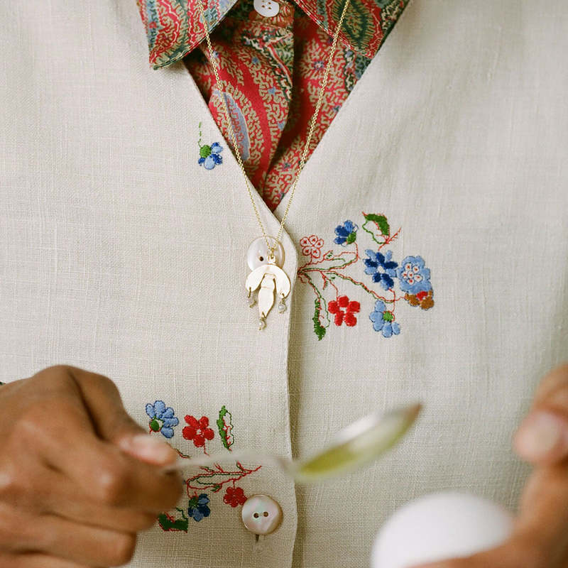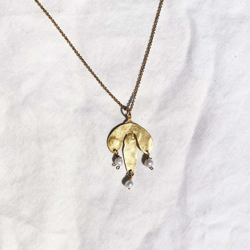 The pendant evokes lightness and flight, it is finished with small cultured pearls .